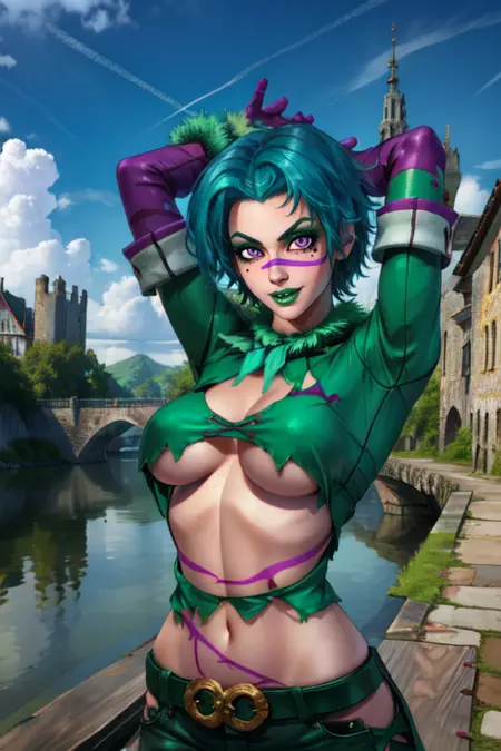 초크, 벨트, 장갑, 녹색 크롭탑, 찢어진 옷, 녹색 벨트, 캐플릿, 허벅지 부츠, 언더부브, 타이트한 검은 바지, 찢어진 검은 스커트, 겐틀렛, 또는 갑옷 장갑,