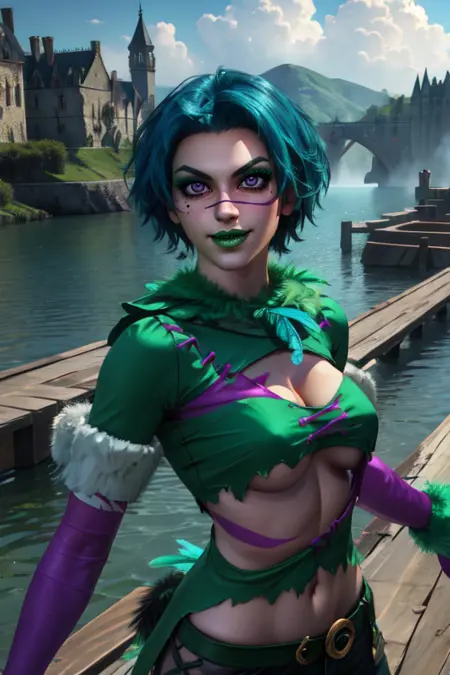 보라색 팔꿈치 장갑, 녹색 찢어진 옷, 녹색 깃털, 젖가슴, 복부, 반바지, 녹색 허벅지 부츠, 벨트, 녹색 옷,