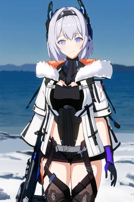 提示词:vidar,不对称头饰,毛边夹克,手套,黑色过膝袜,紧身衣,短裤,