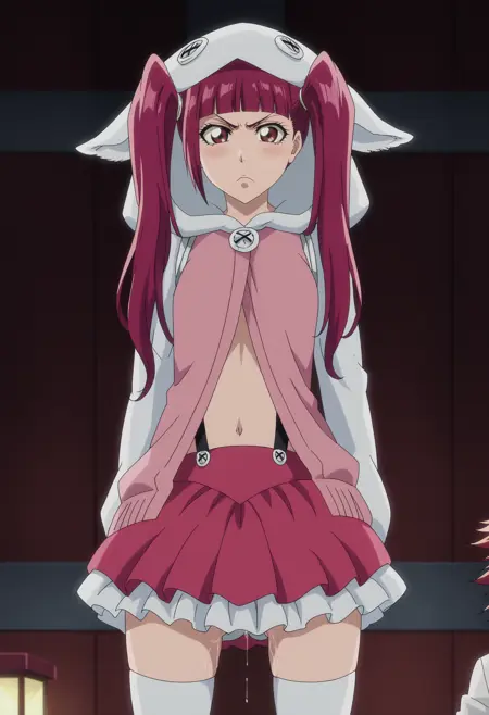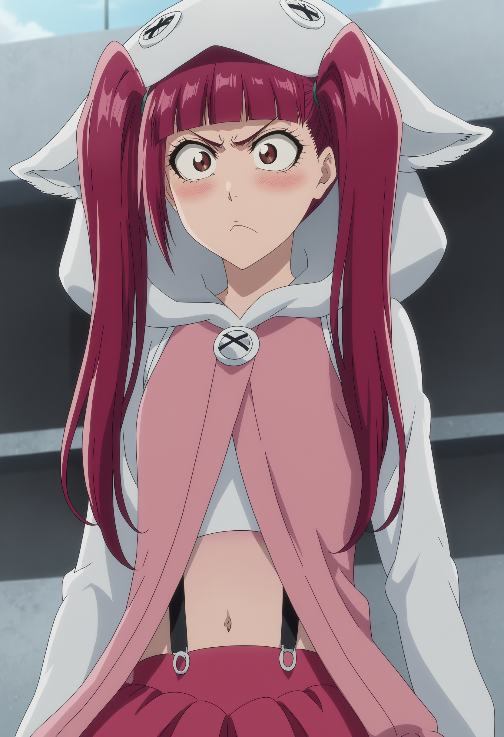 신체: 1girl, 트윈테일, 앞머리, 둔한 앞머리, 보라색 머리, 갈색 눈, 긴 머리, 분홍색 머리, 빨간색 머리, 빨간 눈, dokugamine riruka, bleach: sennen kessen-hen,
