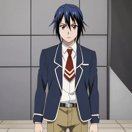 男児っぽい外観付きトリガー:TsugumiAssassin, 学校制服, 赤い目, ネクタイ, 青髪, ジャケット, ブレザー, シャツ, ベルト, パンツ, カウボーイショット