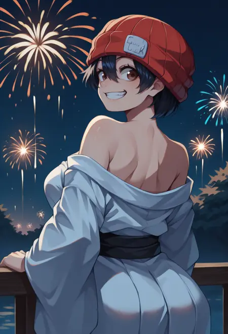 Trigger + Appearance: izumo fuuko, short hair, black hair, hair between eyes, brown eyes, large breasts