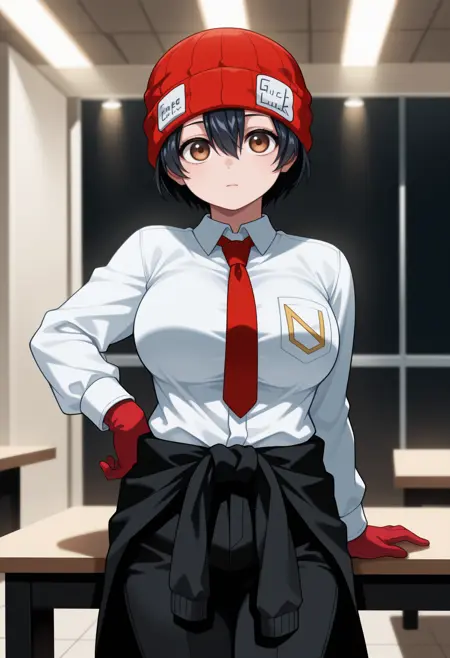 Formal Wear: red headwear, beanie, white shirt, collared shirt, red necktie, long sleeves, red gloves, clothes around waist, jacket around waist, black pants