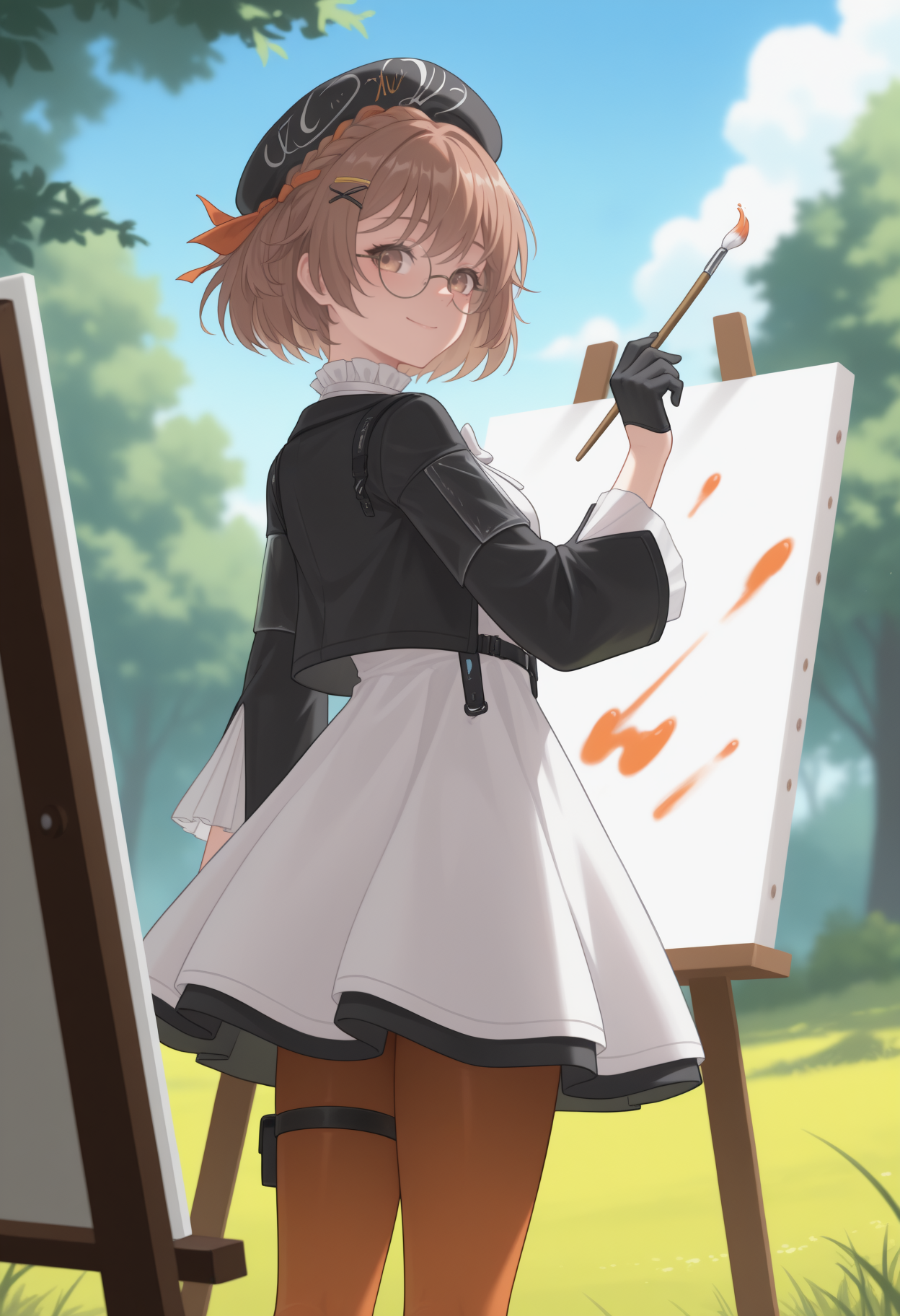 默认服装: 黑色头饰, 贝雷帽, 眼镜, 黑色夹克, 开襟夹克, 长袖, 白色连衣裙, 荷叶边领子, 白色蝴蝶结, 黑色手套, 橙色连裤袜, 大腿绑带