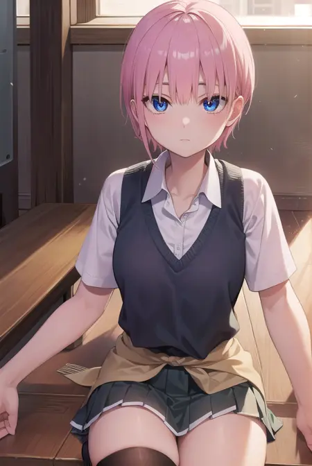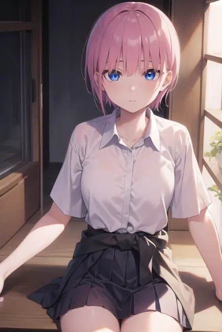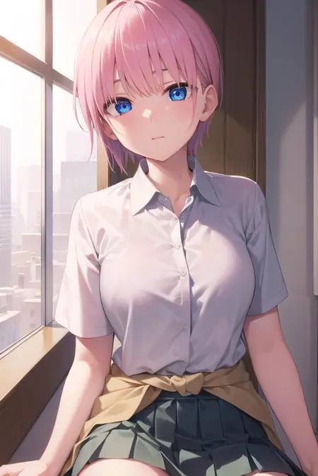 Appearance: ichika nakano, short hair, bangs, blue eyes, hair between eyes, pink hair, earrings,