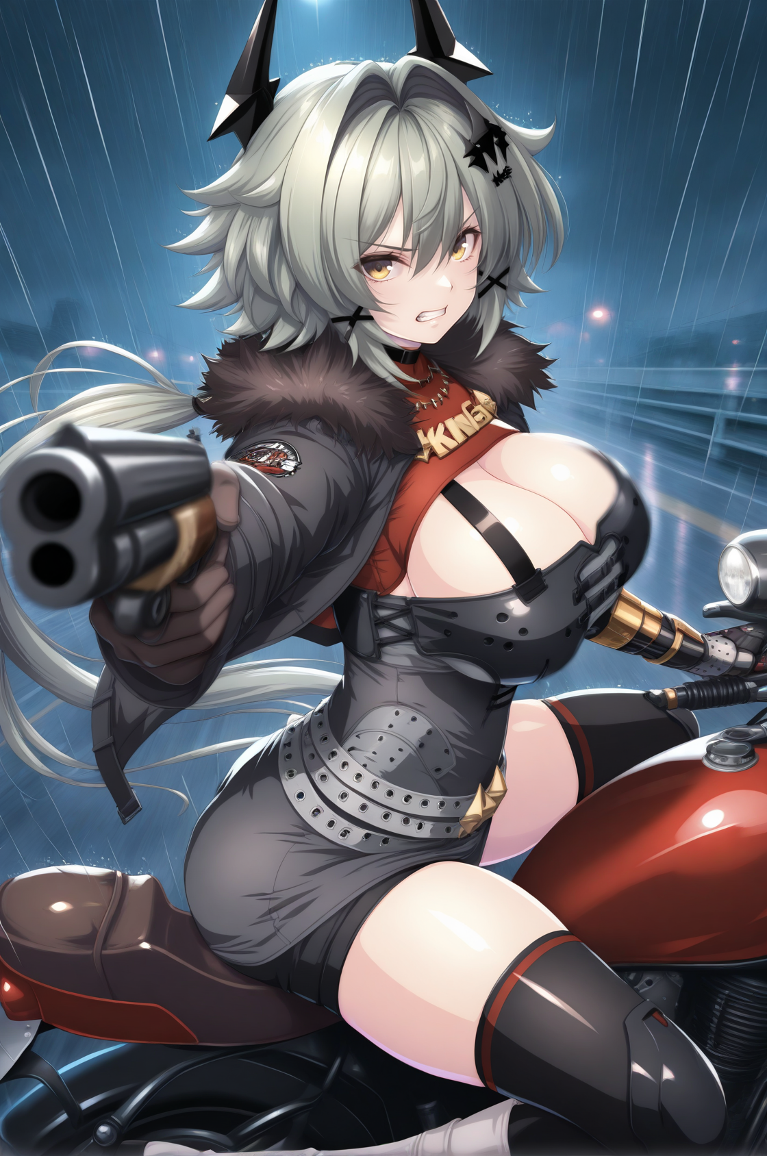 衣装:毛皮切り替えジャケット、短めのジャケット、黒いジャケット、グレーのドレス、胸元の開き、黒い胸ガード、赤いタートルネック、クラスプ、ストラップ、グレーのベルト、ベルトのバックル、ハーネス、黒いショーツ、白いブーツ、黒いタイツ、片手用手袋、黒い手袋