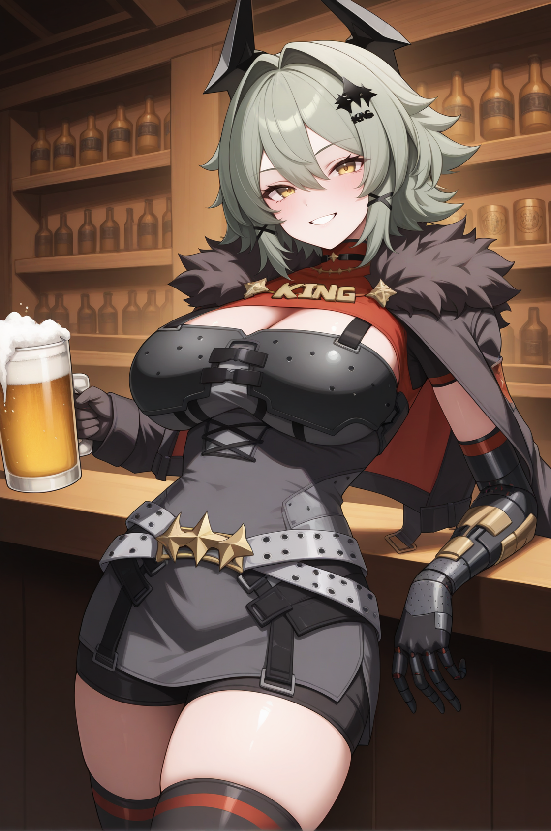 外見:kgc、緑の髪、黄色い目、髪の毛が顔を覆う、目と目の間の髪、サイドロックス、低めのポニーテール、x髪飾り、髪飾り、偽の角、大きな胸、片方の機械式腕