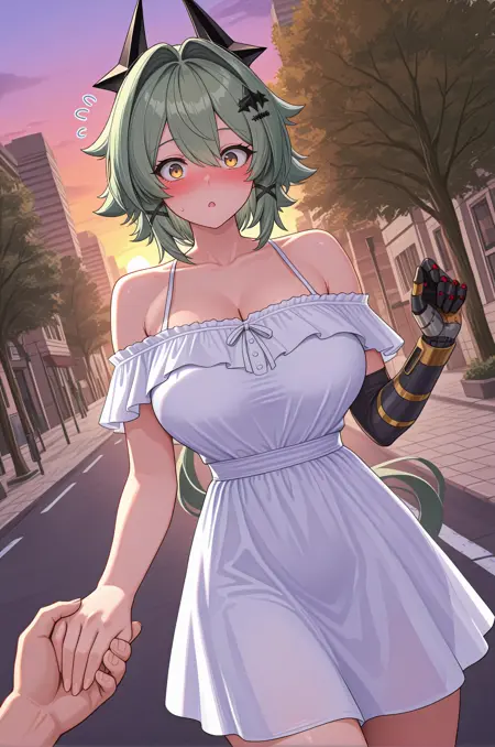 외모: kgc, 녹색 머리카락, 노란 눈, 머리카락이 눈 사이로 흐르는 것, 옆머리, 낮은 꼬리, x 머리 장식, 머리 장식, 가짜 뿔, 큰 가슴, 한쪽 기계 팔