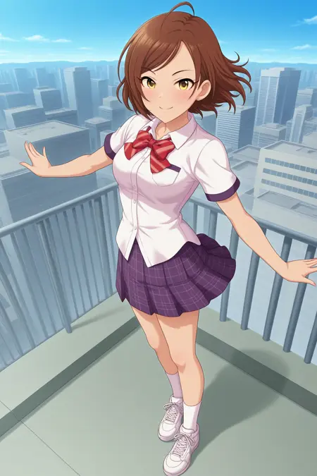 im yujin, brown hair, short hair, ahoge, yellow eyes, long eyelashes, idolmaster cinderella girls, school uniform, short sleeves, purple sleeve ends, white shirt, collared shirt, breast pocket, red bowtie, untucked shirt, purple skirt, plaid skirt, pleated skirt, miniskirt