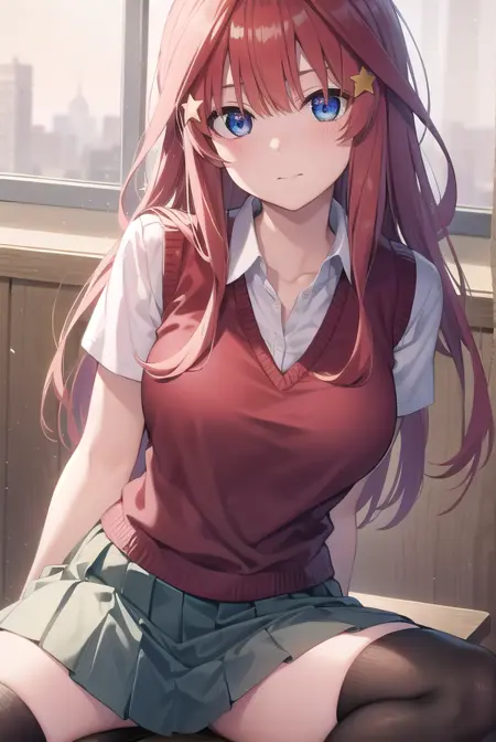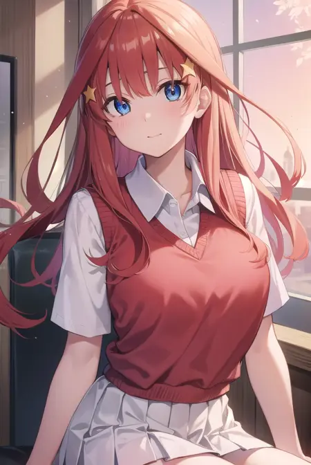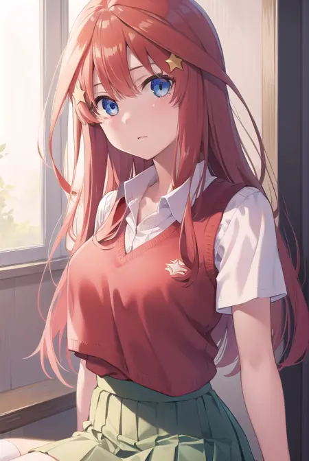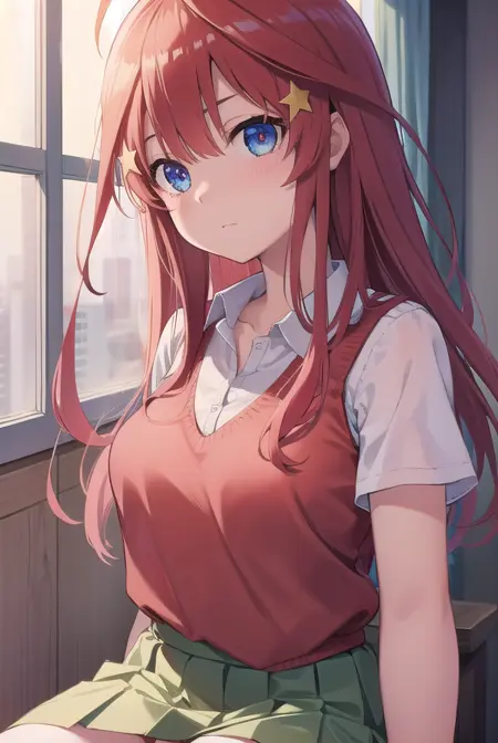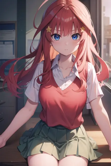 외모: itsuki nakano, 앞머리, 파란 눈, 눈 사이의 머리카락, ahoge, 붉은 머리카락, 별 \(기호\), 머리 장식, 별 모양 머리 장식,