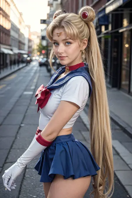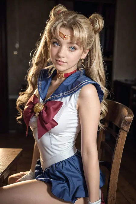 正面提示: LORA, 写实, 杰作, 详细, 8K, 美丽的月野兔摄影, 水手月亮, 长发, 饰品, 水手战士制服, 蓝色水手领, 金发, 红色项圈, 双马尾, 红色蝴蝶结, 蓝色短裙, 蓝眼睛, 发髻, 白色手套, 肘部手套, 分开刘海, 花环, 发髻装饰, 瘦长身材, 沙漏型身材, 大腿粗壮, 长睫毛, 上半身拍摄...