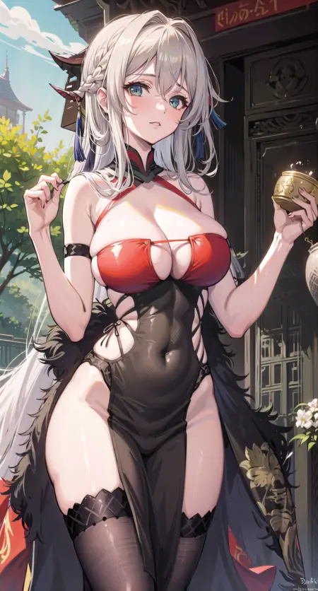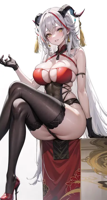 PS:可将其作为角色LoRA使用,建议提示词: goldendragon hairstyle, outfit-goldendragon, breasts, 1girl, solo, yellow eyes, long hair, cleavage, streaked hair, looking at viewer, red hair, white background, sitting, crossed legs, thighs