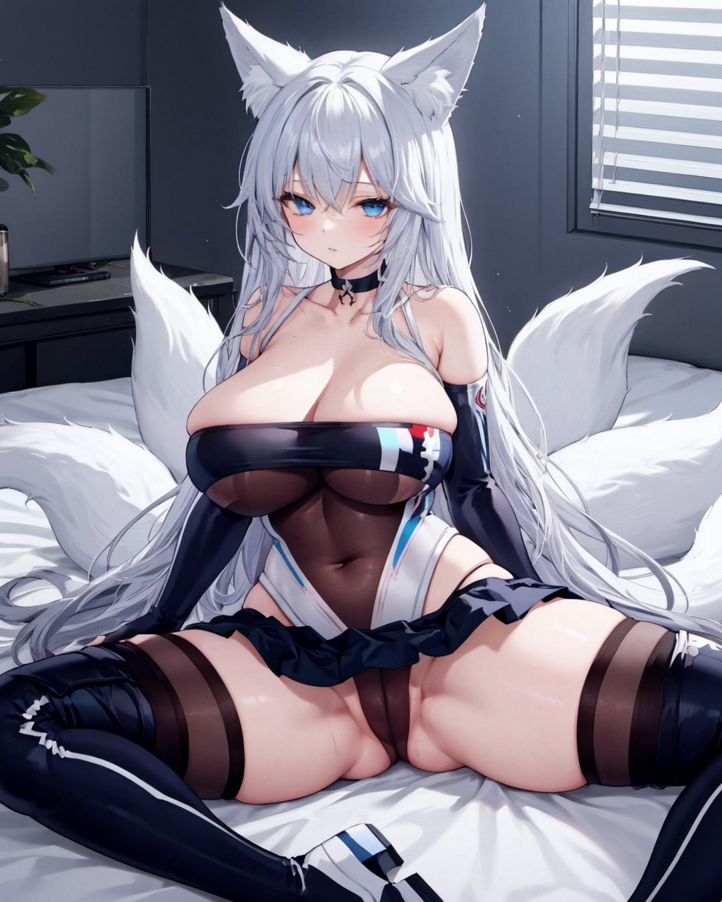 Full outfit: race queen, highleg leotard, microskirt, thigh boots, elbow gloves, black choker
