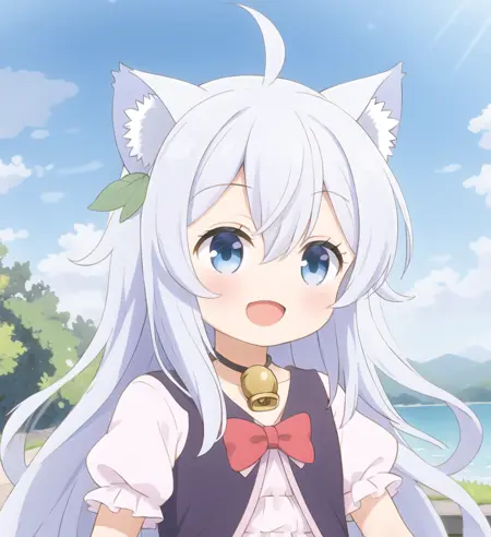 - 1girl, solo, noella's, ahoge, blue eyes, animal ears, animal ear fluff, bangs, hair between eyes, white long hair, wolf tail