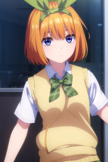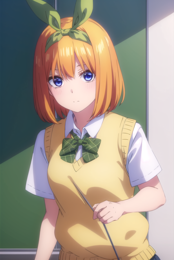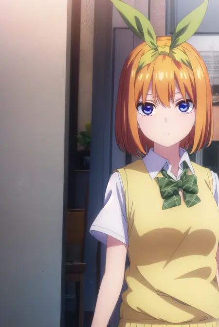 yotsuba nakano, 刘海, 短发, 蓝眼睛, 发丝遮眼, 发带, 发箍, 橙色头发, 绿色发带,