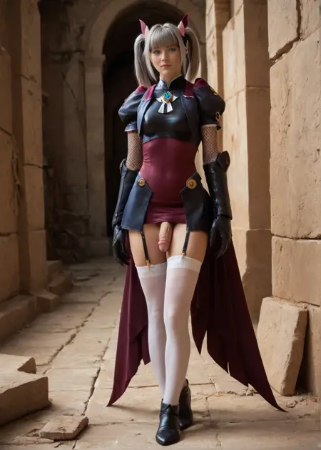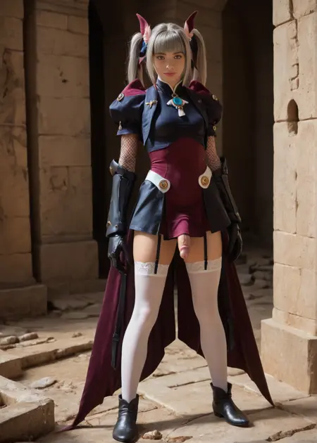 fmsevensevenvillainess,1个女孩,单独,绿眼睛,双马尾,过膝袜,灰发,渔网袜,刘海,白色过膝袜,宝石,爪子,胸针,小乳房
