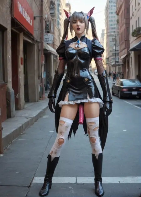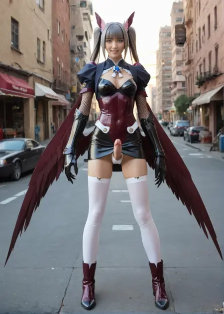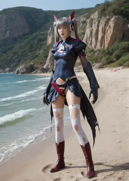 fmsevensevenvillainess, 1girl, solo, green eyes, twintails, thighhighs, grey hair, fishnets, bangs, white thighhighs, gem, claws, brooch, small breasts