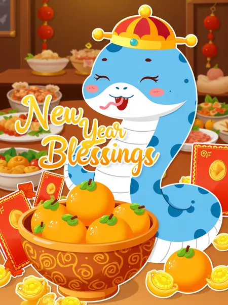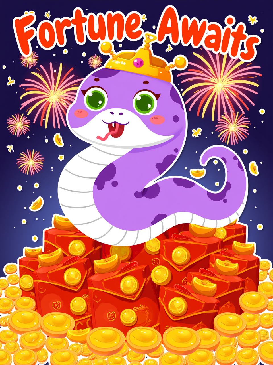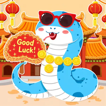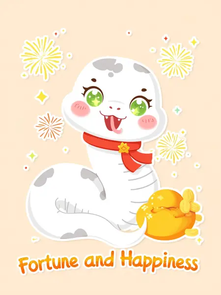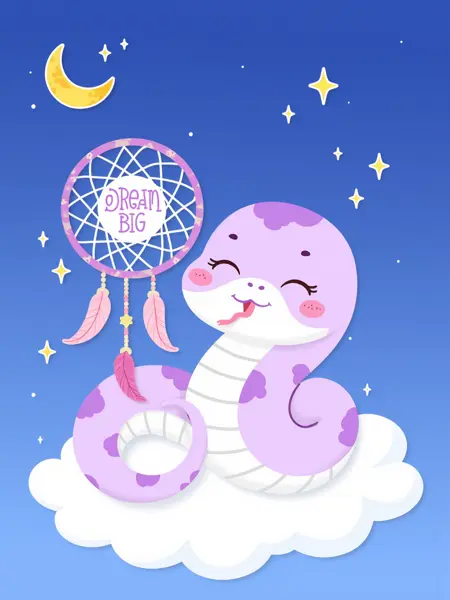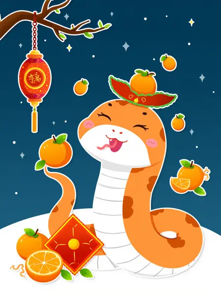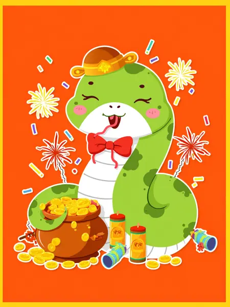 A vector illustration of +snake IP feature description (including color, expression, accessories, actions, etc.) +scene description +background description