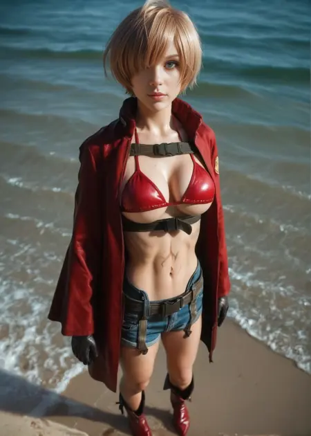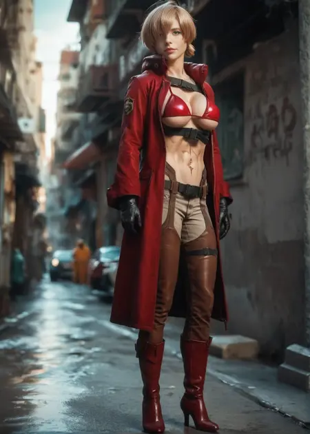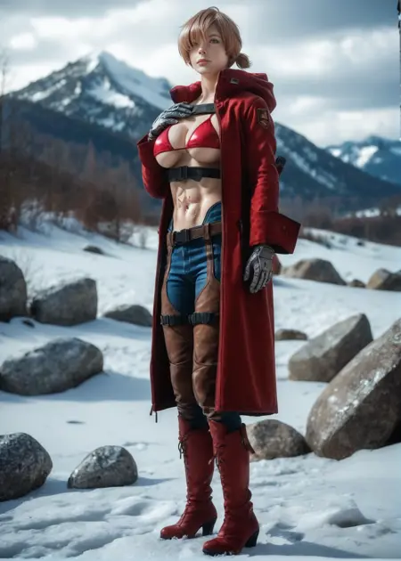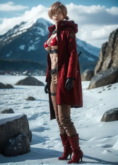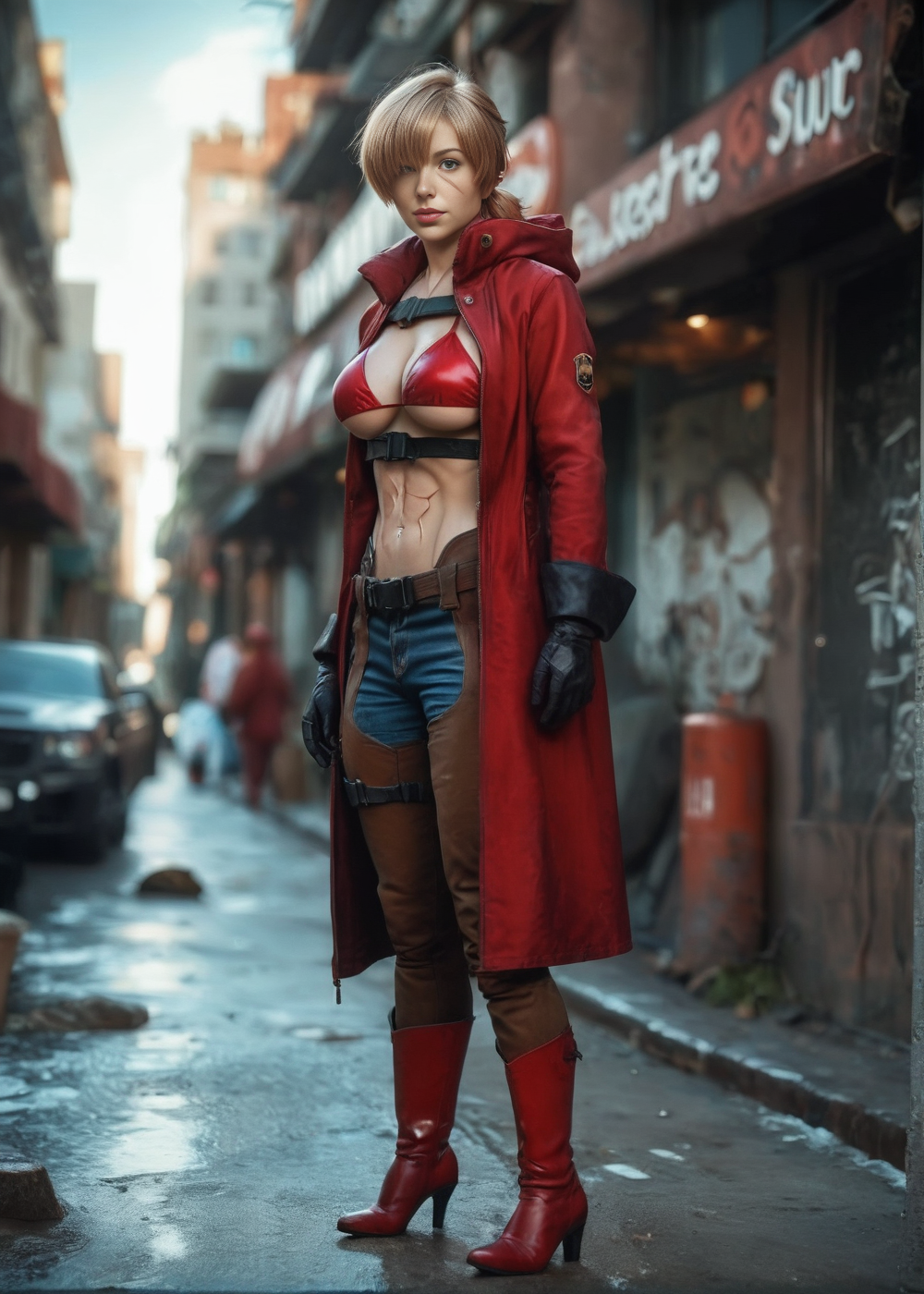peppernogunlife, ソロ, 1人の少女, 片方の目を覆う髪, 大きな胸, ハイヒール, 青い目, 短い髪, ビキニ, ビキニ, 赤いコート, アンダーブスト, 胸元, ブーツ, 茶色の髪, 顔の傷, 手袋, 前髪, 赤い履物, パンツ