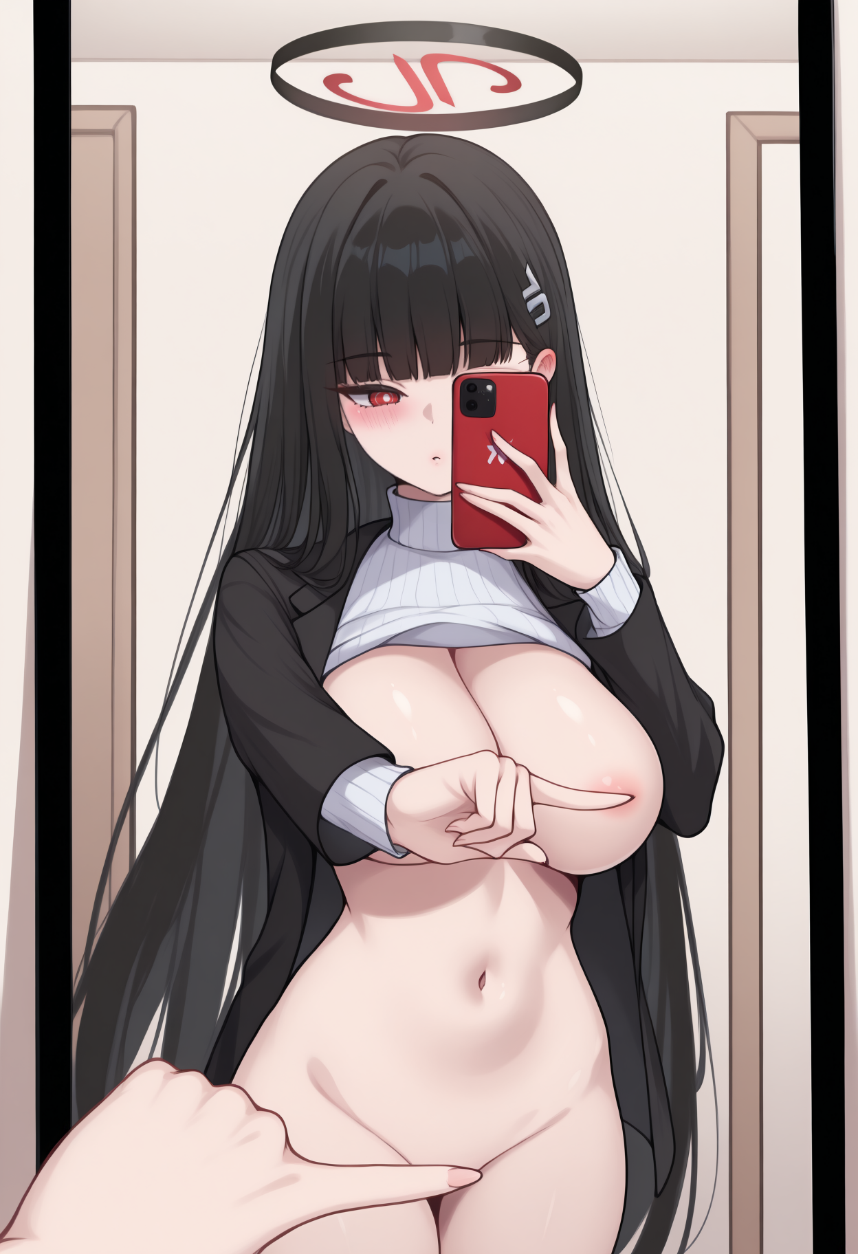トリガー+追加タグ: 1fngrslfe, female pov, holding phone, smartphone, taking picture, selfie, covering privates, covering nipples, covering crotch, reflection