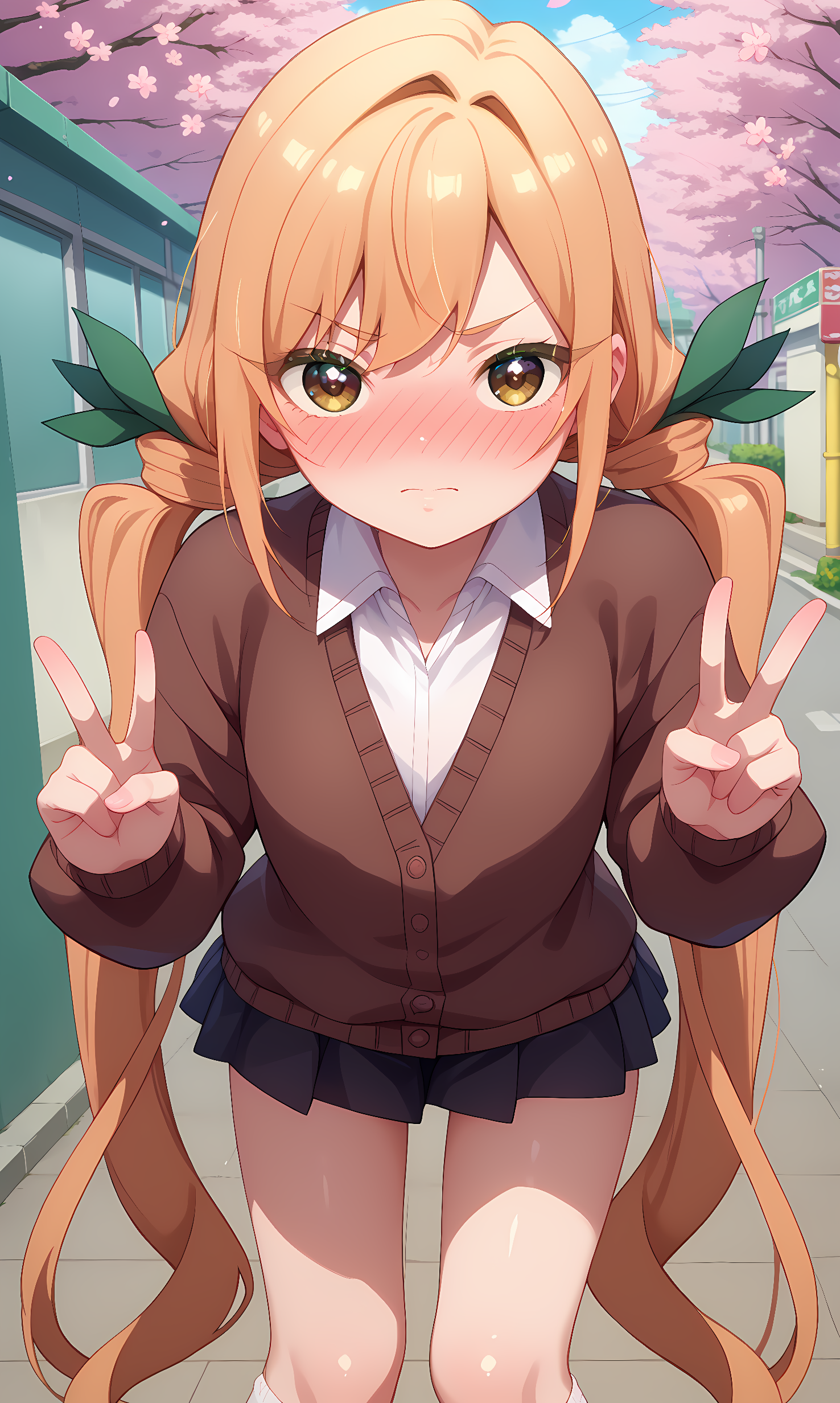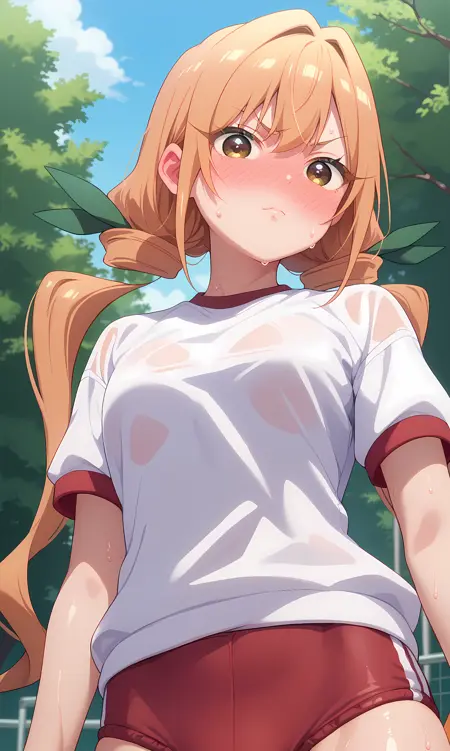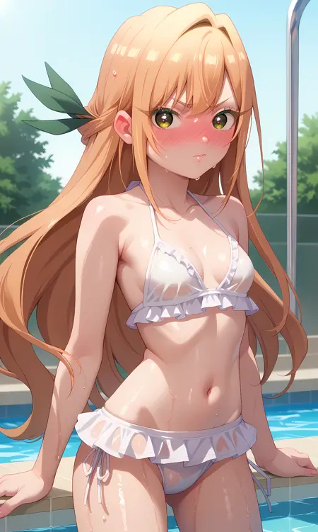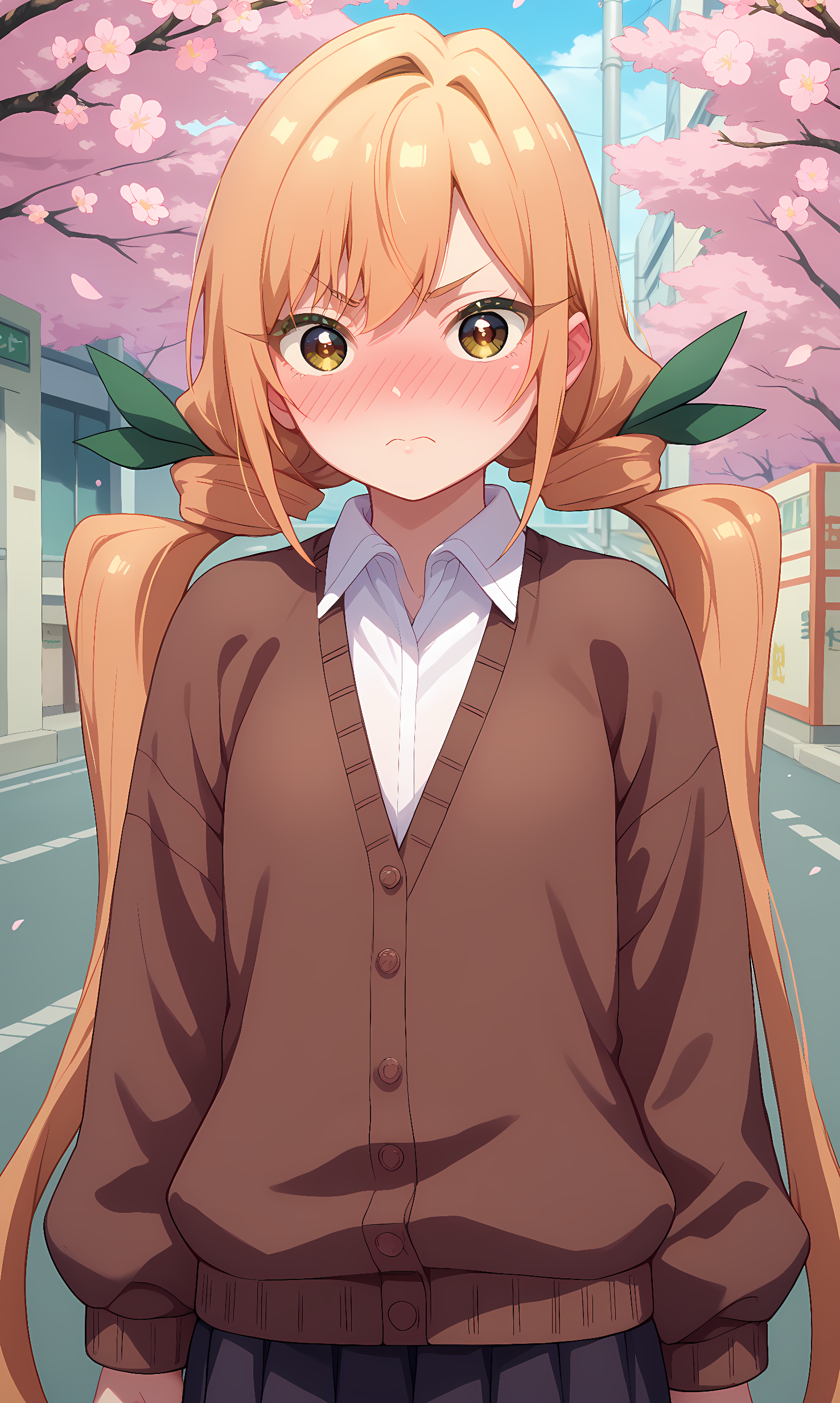 karane_inda,棕色眼睛,橙色头发,长发,低双马尾,绿色丝带,发带