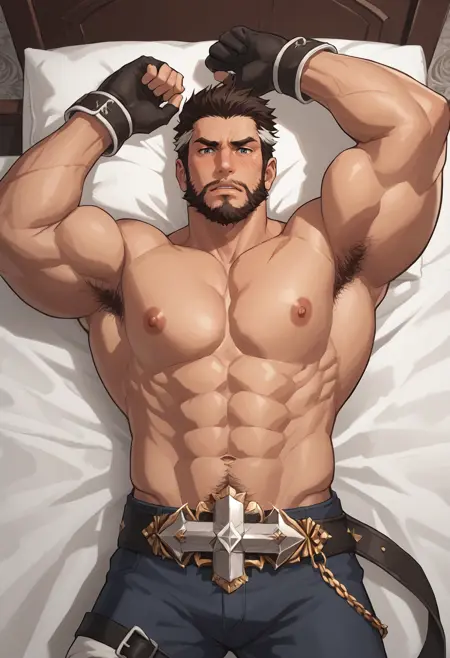 额外标签:** bara,肌肉男性,胡须,彩色头发,裤子,衬衫,夹克,手套,绷带,腰带,夹克搭在肩上,破损衣物,脸上有疤痕,战斗姿势,出拳**