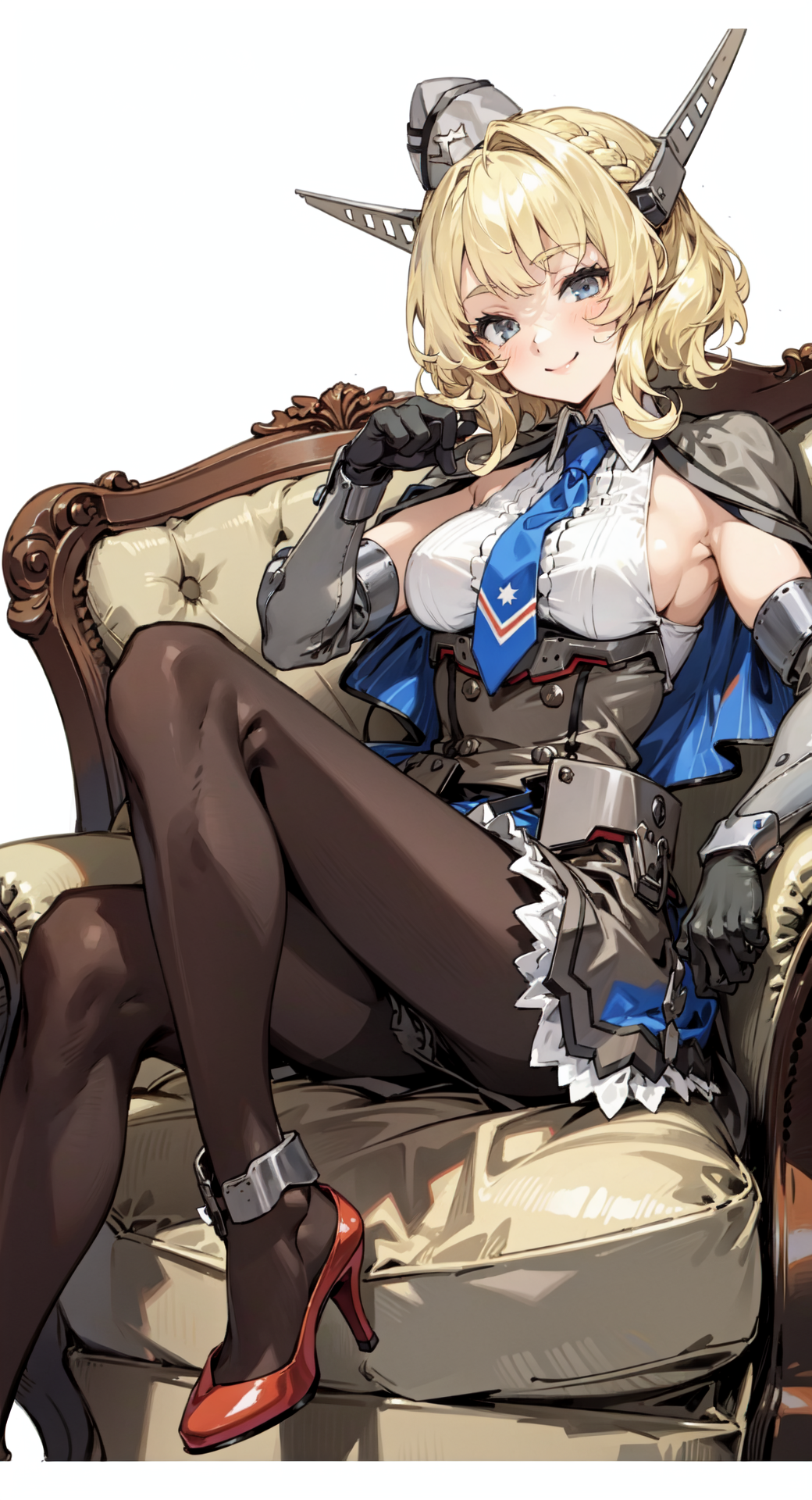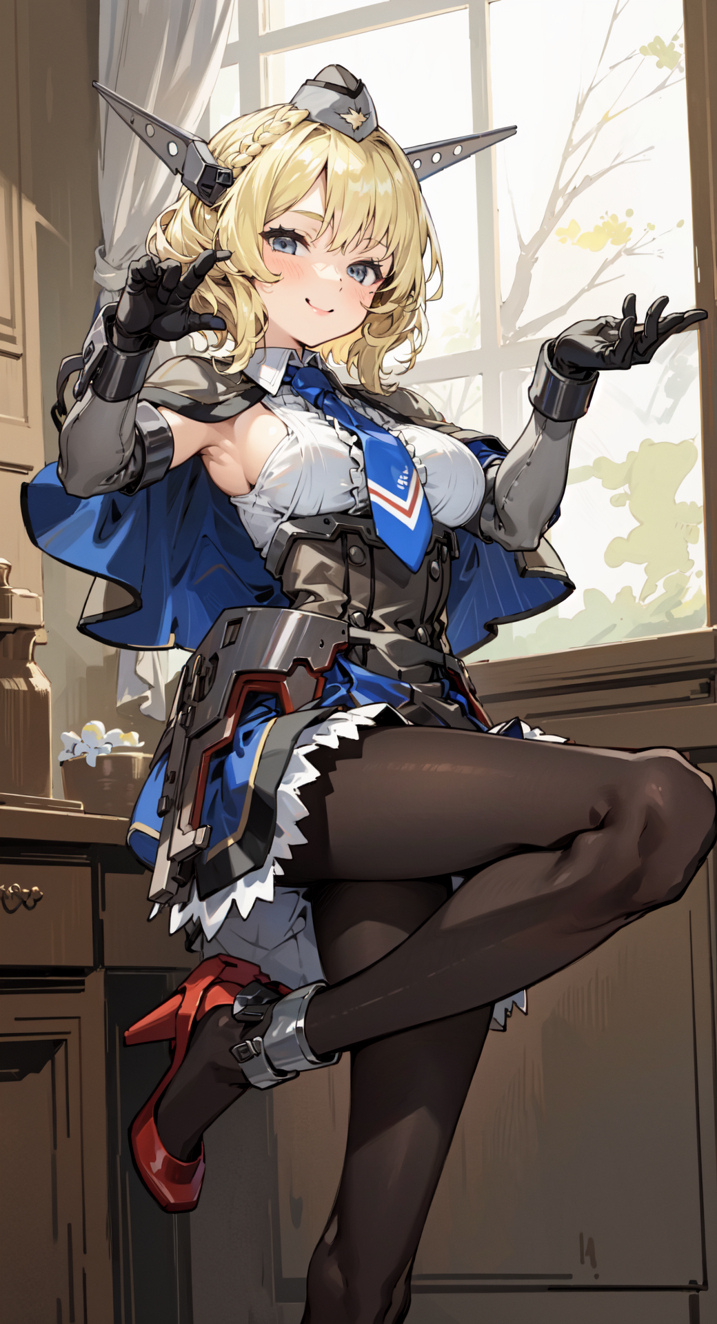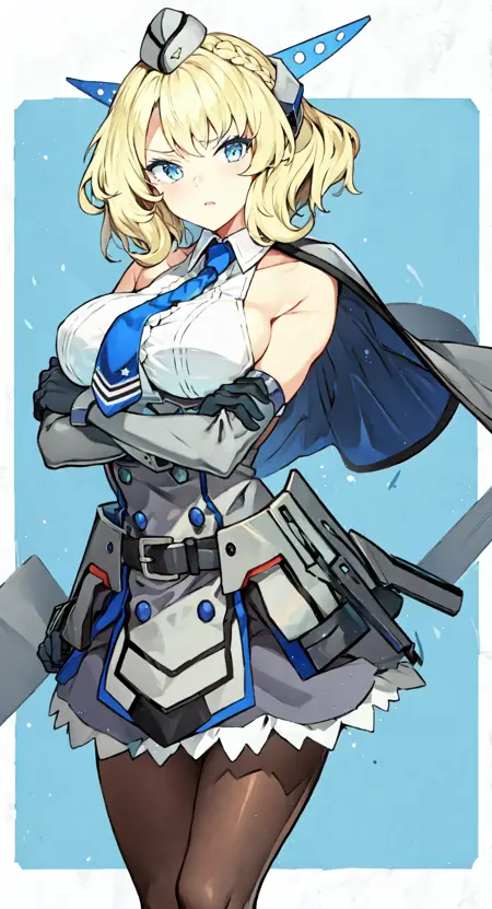 ColoradoOG, blonde, braid, garrison cap, headgear, necktie, backless outfits, grey dress, elbow gloves, pantyhose,