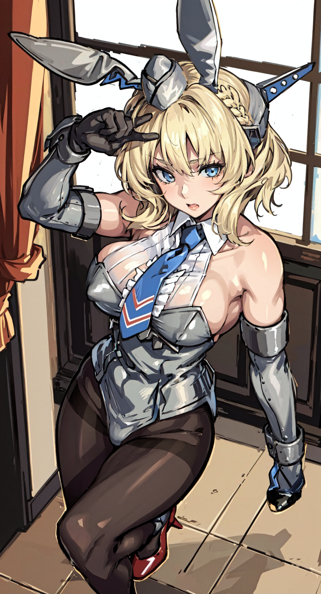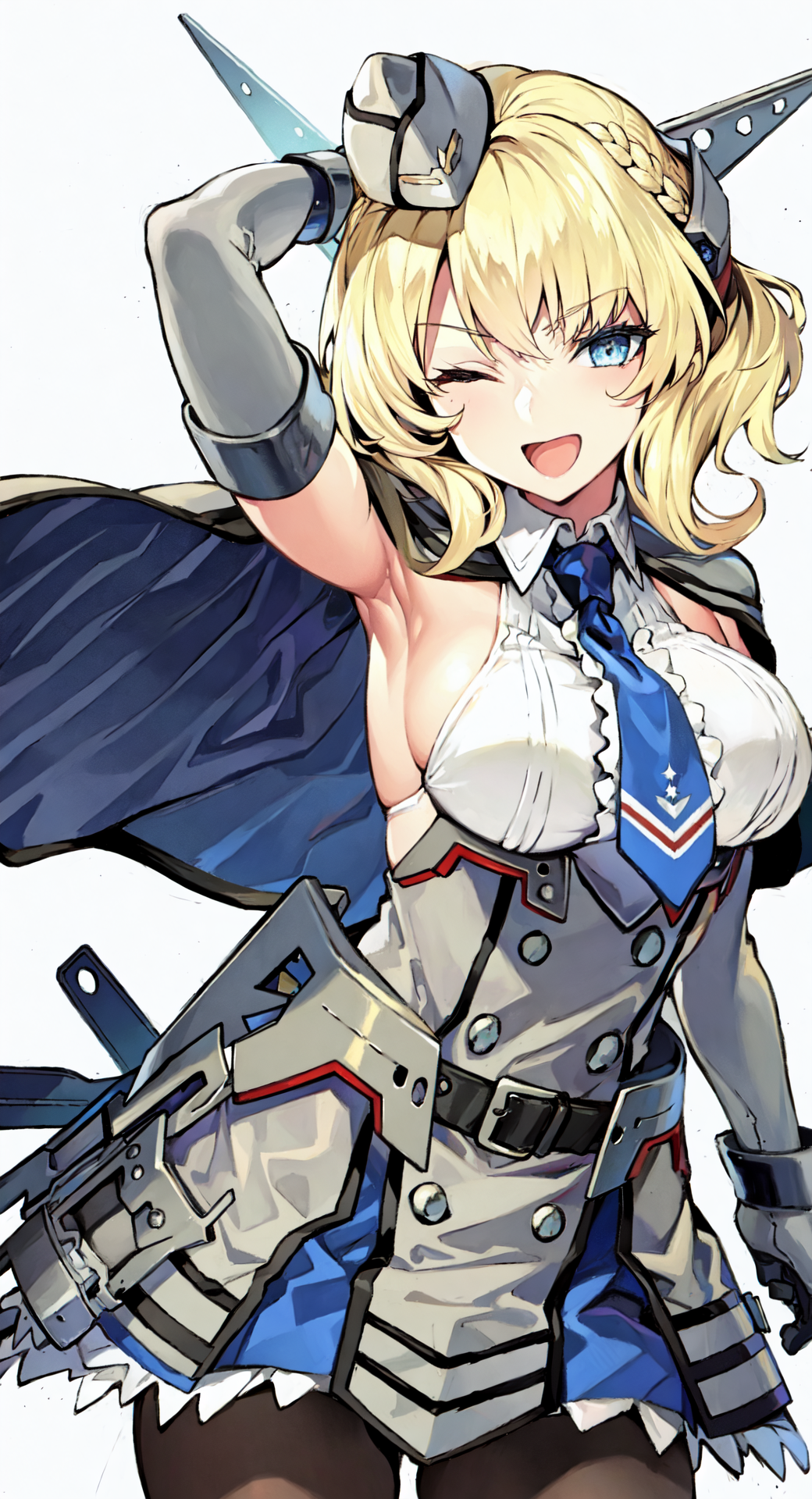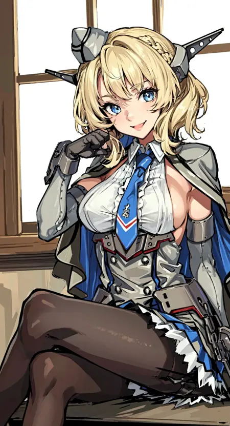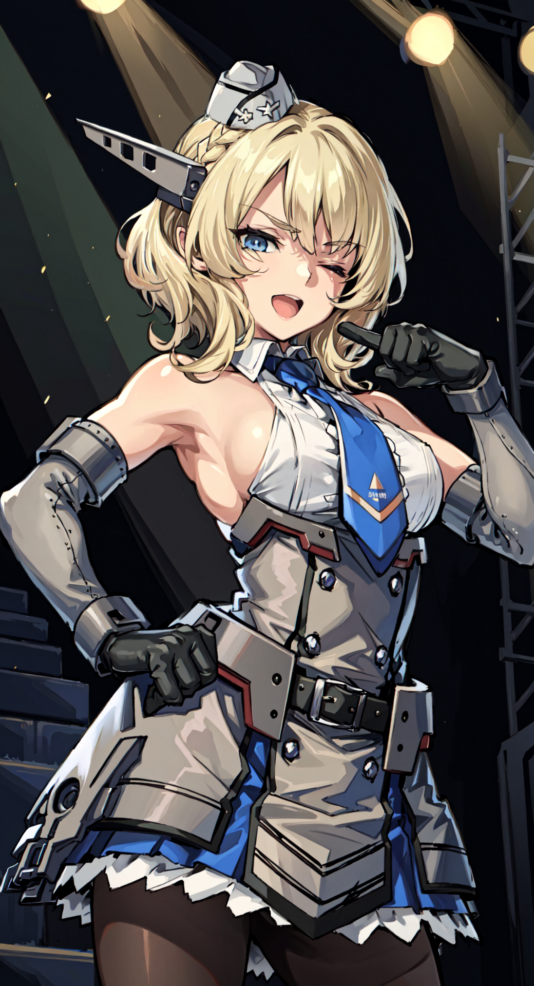 ColoradoOG, blonde, braid, garrison cap, headgear, necktie, backless outfits, grey dress, elbow gloves, pantyhose,