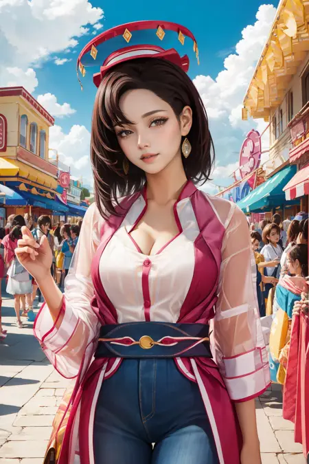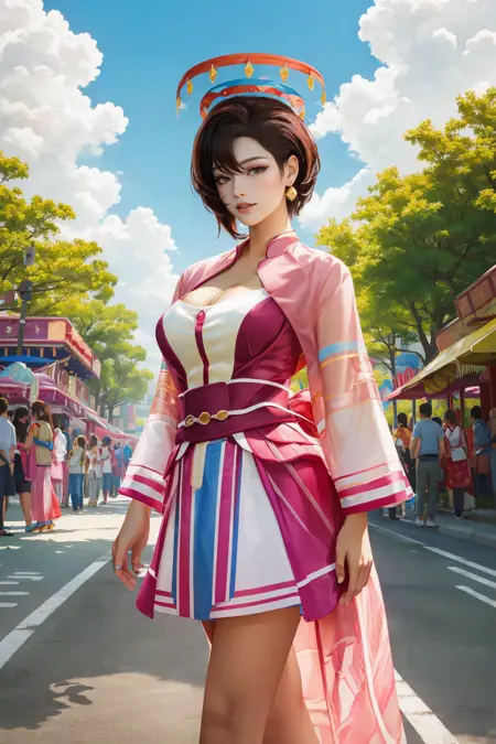 Prompt: 1girl, solo, looking at viewer, blue eyes, brown hair, dress, jewelry, standing, earrings, parted lips, artist name, arm up, lips, head tilt, see-through, makeup, blue background, border, hand on own chest, arm behind head, contrapposto, realistic, nose, blue border