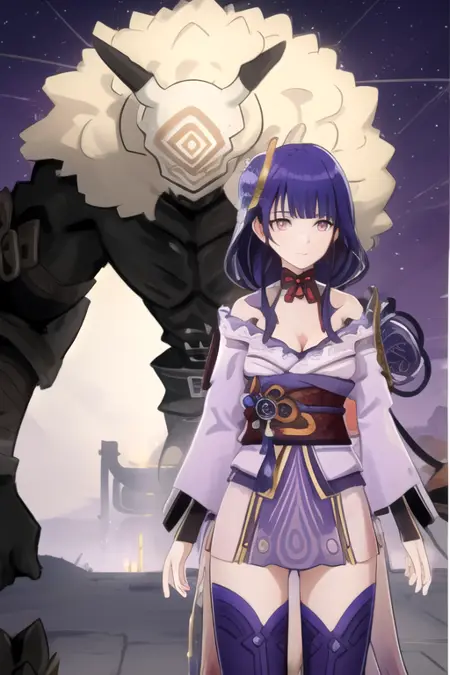 HilichurlEi, a monster and a woman, cowboy shot, standing, smile