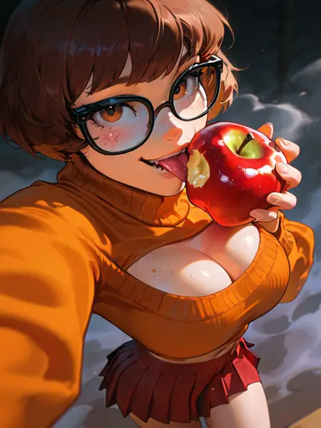 short hair, brown hair, 1girl, glasses, orange sweater, red skirt pleated skirt, black-framed eyewear, brown eyes