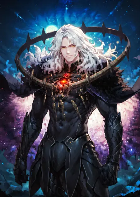 (可选):1boy,solo,男性焦点,长发,白发,黄眼,漂浮的圆形肩披,内衬星空的黑色斗篷,黑色盔甲,闪耀的红色胸甲宝石,