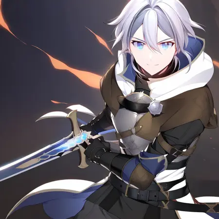 Optional trigger words: white hair, short hair, light skin, blue eyes, white high collar hood, hood down, long white open jacket, black and silver shirt, brown belt, purple epaulets, hand up, peace sign,
