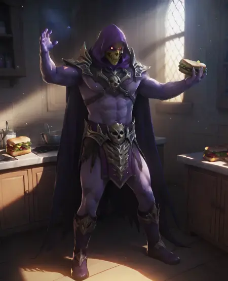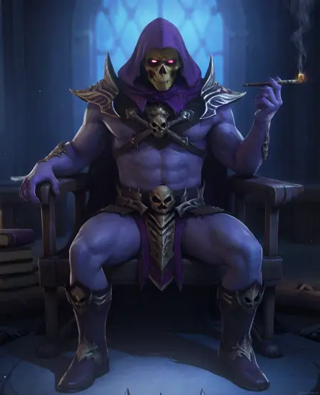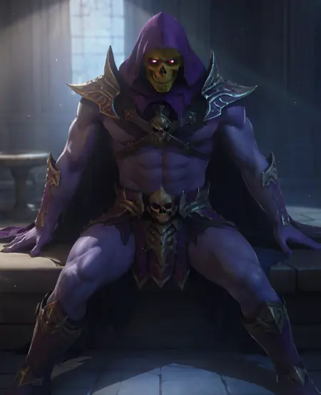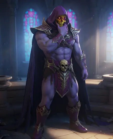 トリガー: SkeletorRSL, 1boy, hood, glowing eyes, skull, muscular, colored skin, purple skin