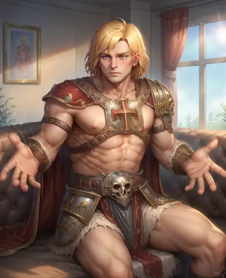 Triggers: He-ManRSL, 1boy, medium hair, blonde hair, blue eyes, muscular, manly
