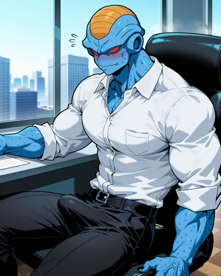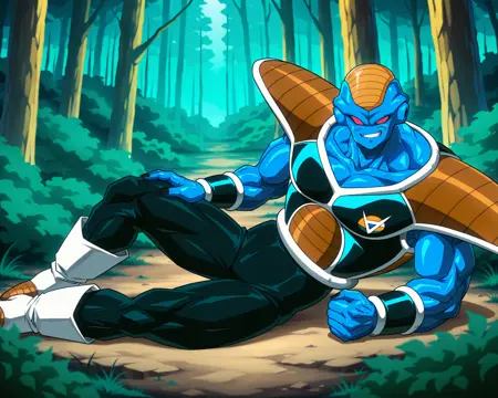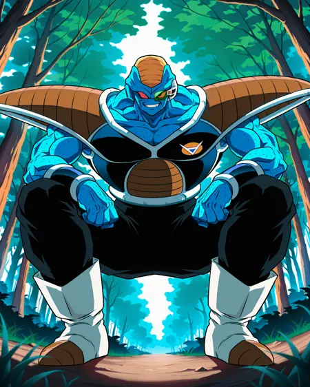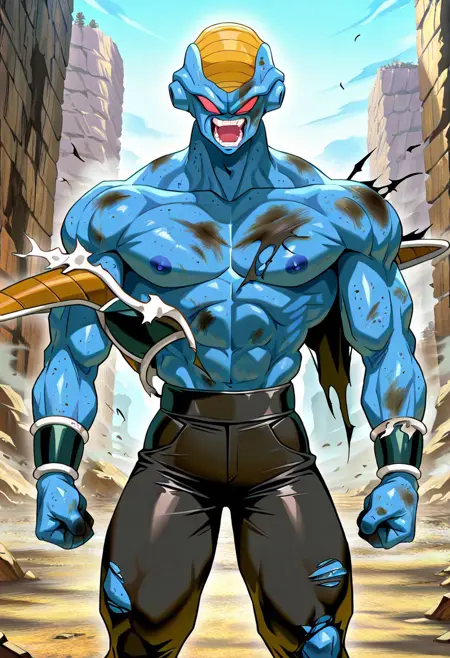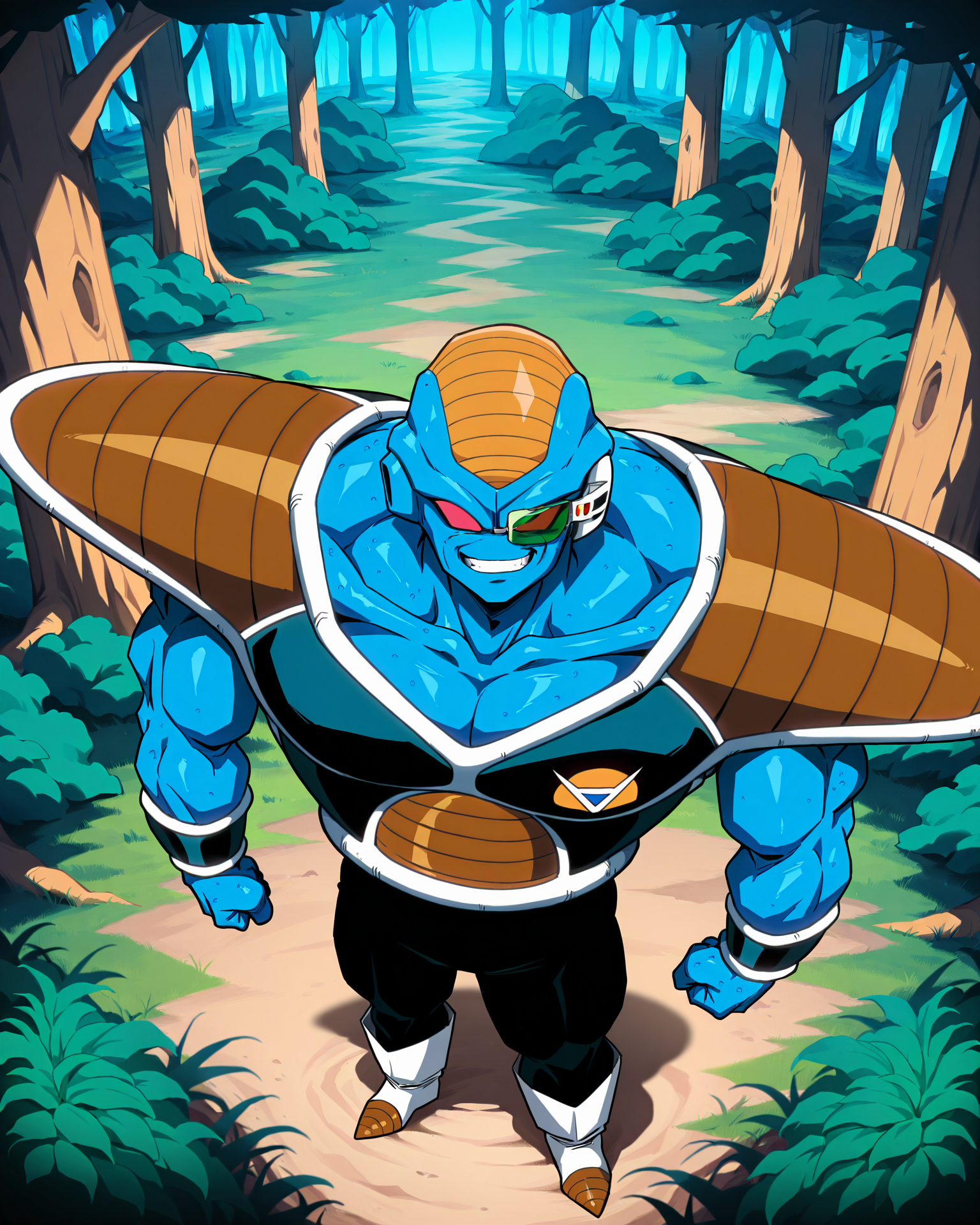 Tags: burterdb, blue skin, red eyes, saiyan armor, muscular, scouter, boots