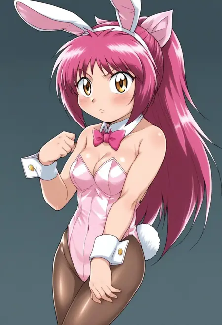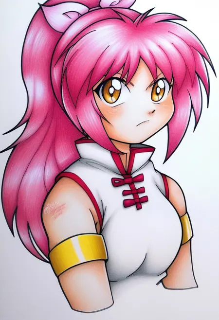 beyblade g revolution, mao chou, 1girl, solo, yellow eyes, long hair,pink hair, ponytail, chinese clothes, dress, armlet, ribbon, hair ribbon, bow