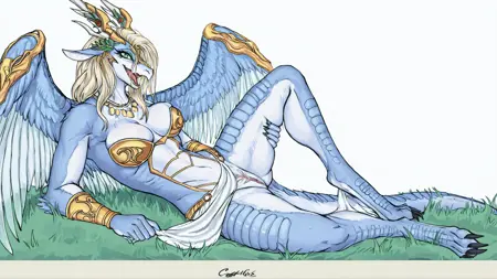 Optional Tags: blue scales, white belly, horns, tail, claws, blonde hair, feathered wings, antlers, white loincloth, abdomen plate