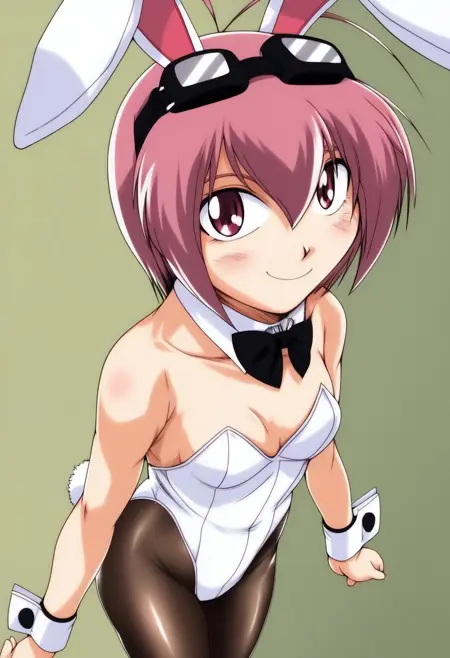 beyblade g-revolution, mathilda, 1girl, solo, thighhighs, goggles, goggles on head, short hair, shorts, antenna hair, pink hair, pink eyes, green shorts, cleavage cutout, cropped jacket, yellow shirt, blue thighhighs, ahoge