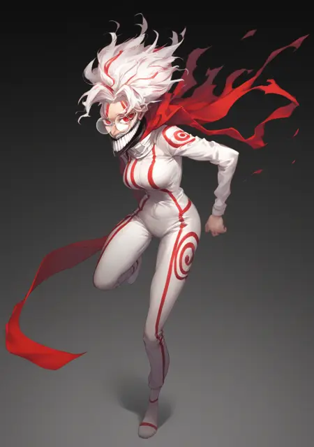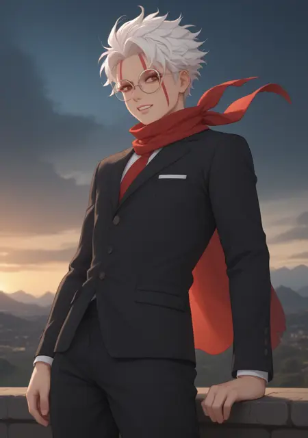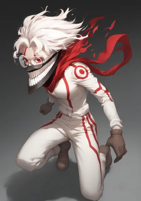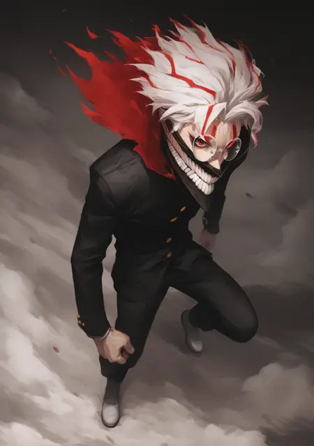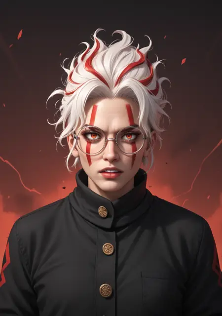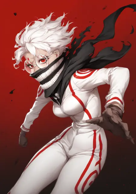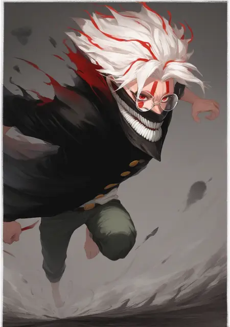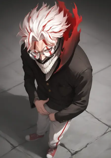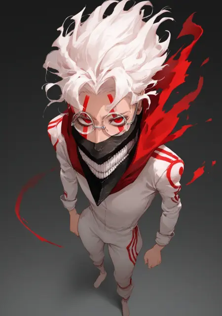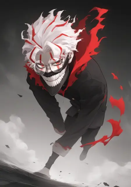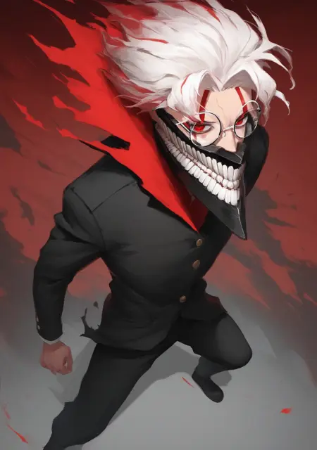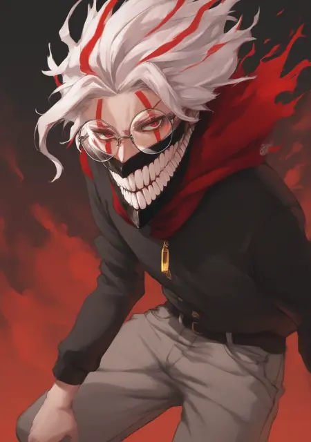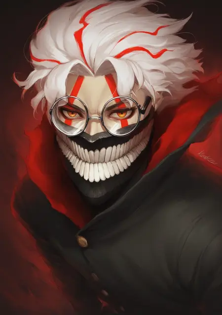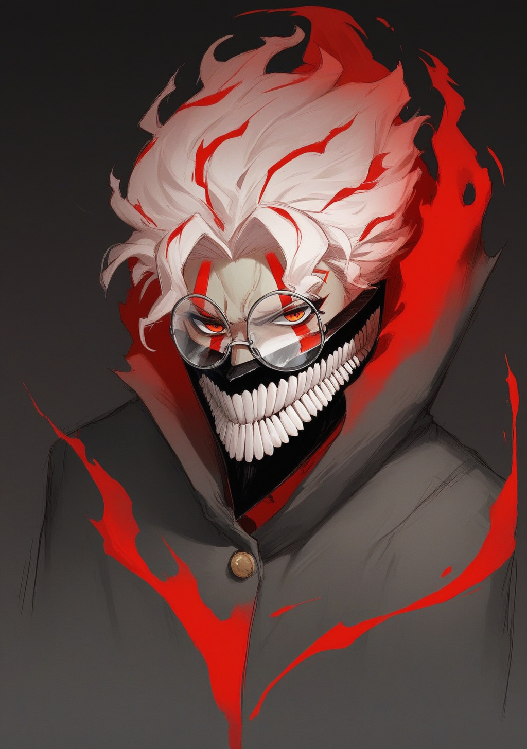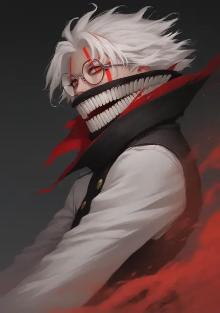 프롬프트: ken takakura, dandadan, 흰 머리, 큰 이, 큰 입, 스카프로 가린 입, 둥근 안경, 창백한 피부, 얼굴에 붉은 선, 저주받은, 붉은 머리 테두리, 붉은 눈,