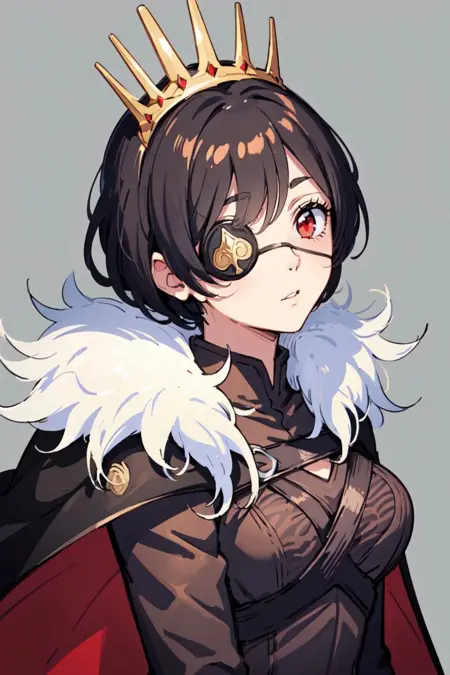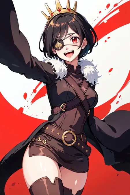 基本的なスタートには、以下のタグを使用してください:pikkyvanica, 1girl, solo, eyepatch, one eye covered, tiara, crown, fur trim, nipples, thighhighs, thigh boots, boots, belt, cape, jacket, vest, harness