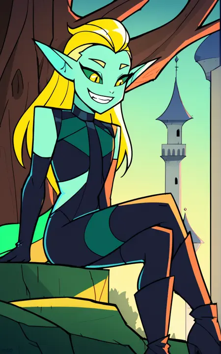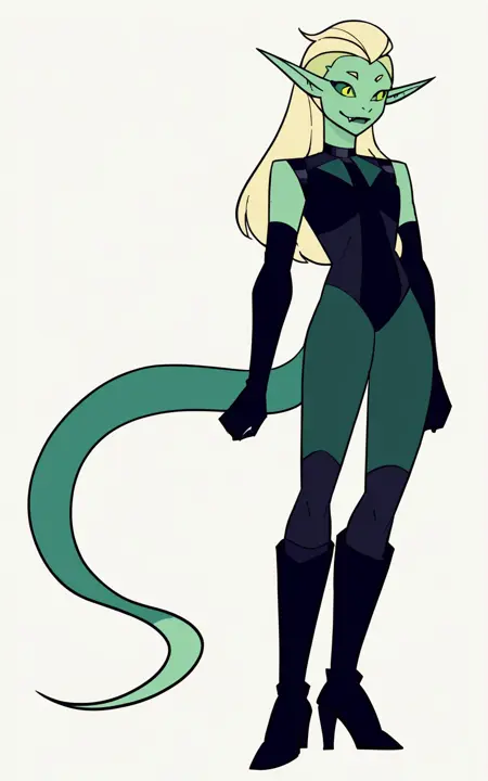**Reinforcement Tags: **blonde hair,tail, pointy ears, colored skin, green sclera, green skin, long hair,flat chest,yellow eyes