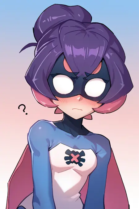 amcharlie,purple hair , short hair , hair bun,1girl, White Leotard,blue bodysuit,Multicolored hair,domino mask, pink cape