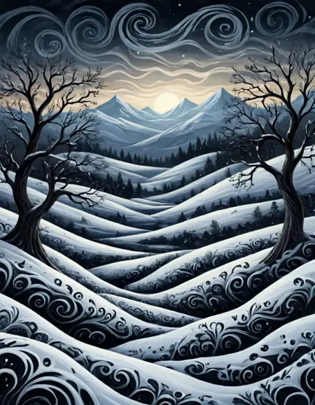 회전하는 패턴이 있는 어둡고 우아한 스타일. 트리거만으로 충분한 회전 패턴이 나오지 않는다면 "swirls" 또는 "swirly"를 추가해 보세요. 대칭성, 장식적 선, 아르누보, 고딕 스타일과도 잘 어울립니다.