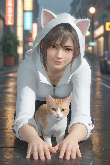 partially unzipped, hooded jacket, see-through, lace trim, star print, hood down, pink hood, plaid hood, white hooded jacket, lace trimmed hooded jacket, star print hooded jacket, red drawstring, long sleeves, grey sleeves, sleeves past wrists, red sleeve cuffs, zipper, pink pocket, bikini under clothes, bikini visable through clothes, orange trimmed bikini top, bikini bottom, orange bikini bottom, plaid bikini bottom