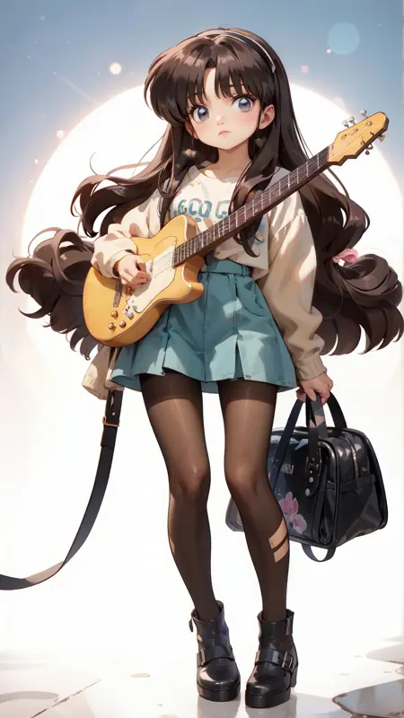 Example prompt : "an anime girl, 1girl, solo, long hair, simple background, brown hair, white background, holding, standing, full body, weapon, pantyhose, retro artstyle, 1980s (style)"