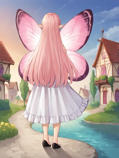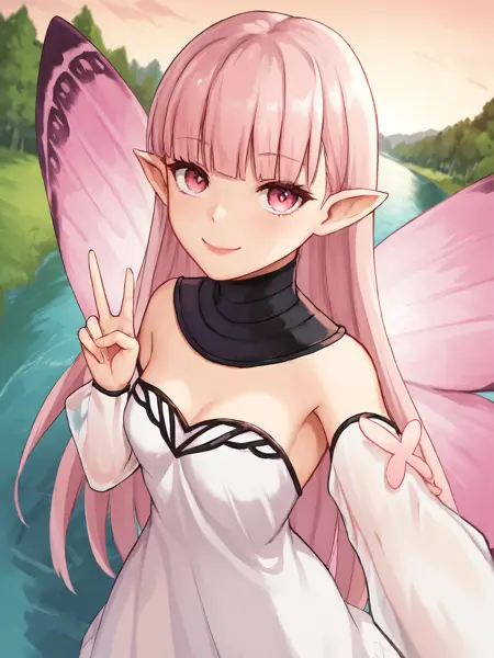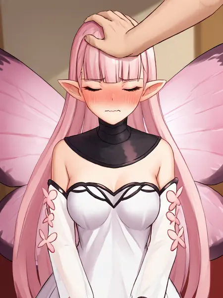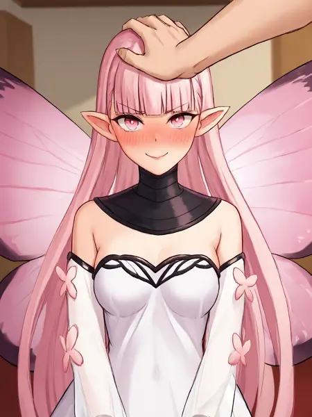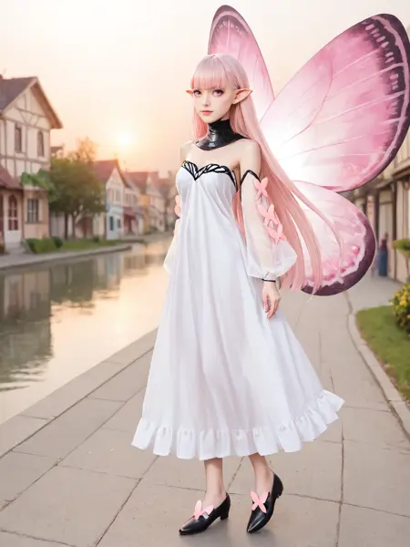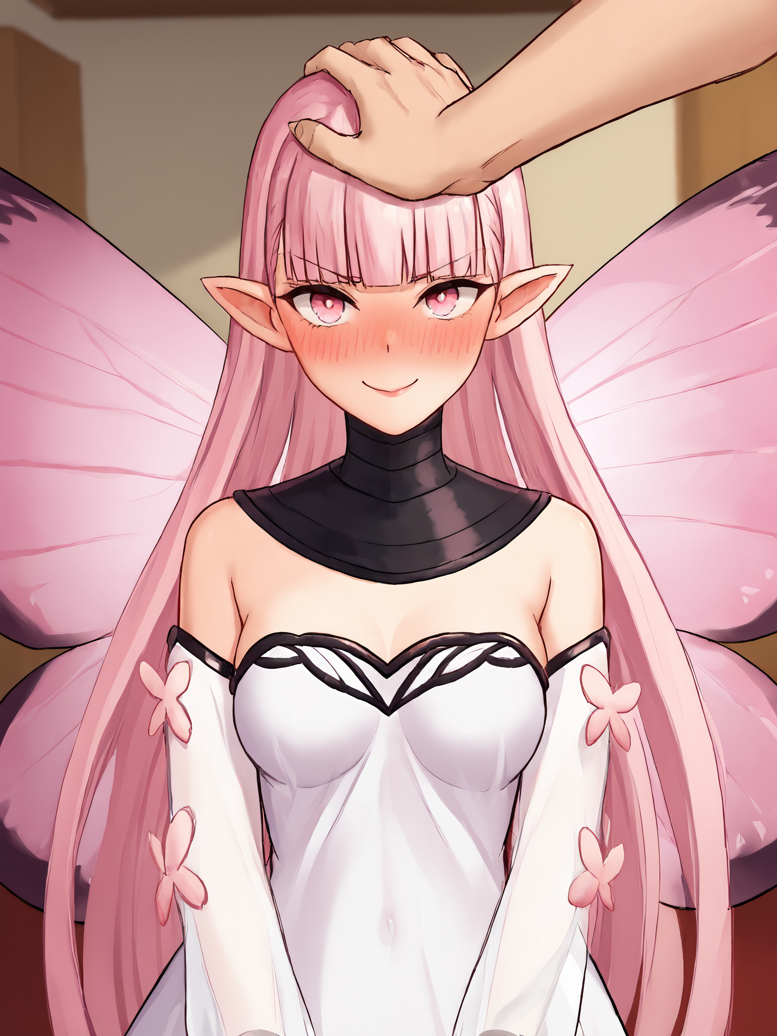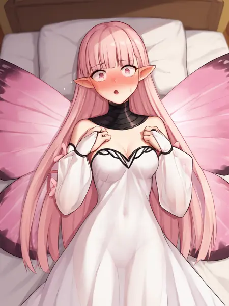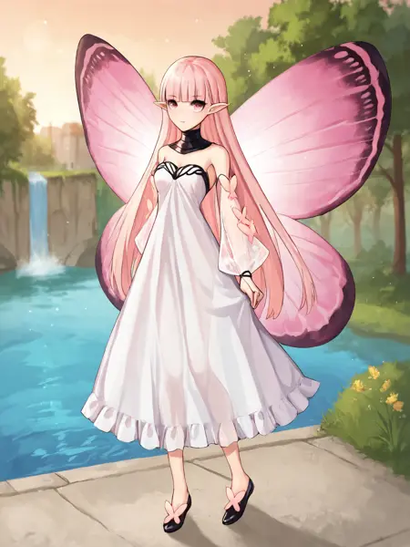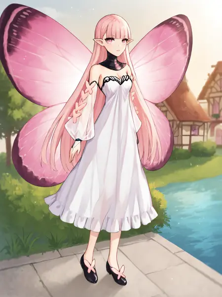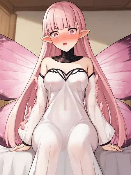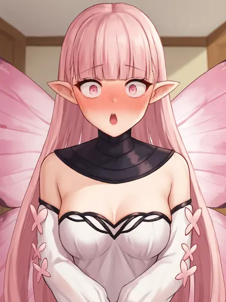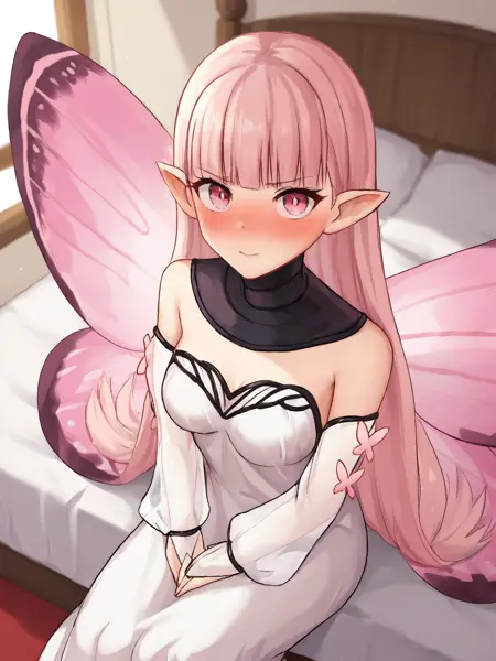 coralfategrandorder, fairy, pink eyes, pointy ears, long hair, pink hair, blunt bangs, white dress, detached sleeves, bare shoulders, puffy sleeves, butterfly ornament, see-through sleeves, medium breasts, butterfly wings, fairy wings, insect wings, pink wings