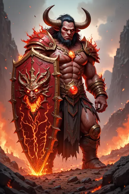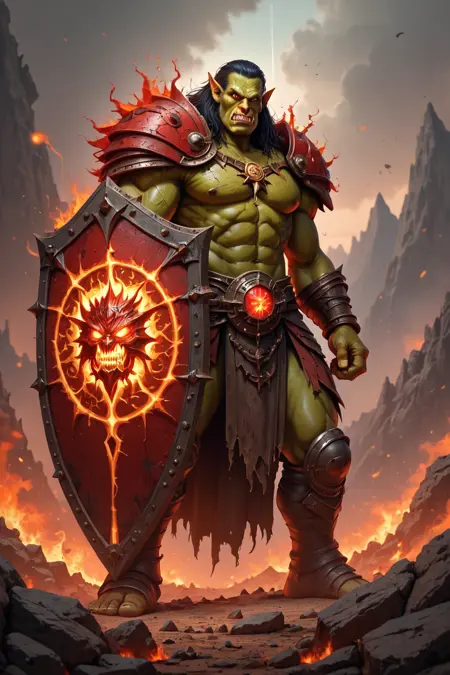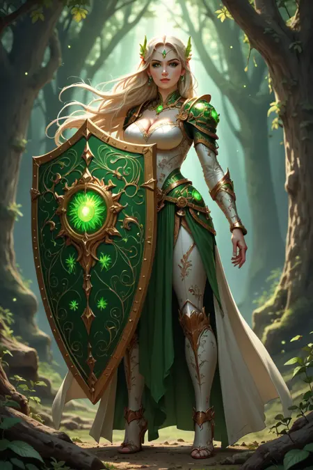 "영화 같은 전신 묘사: 고대의 나무 드루이드. 지혜와 자연의 힘을 지닌 존재가, 녹색 껍질로 만들어지고 살아있는 덩굴이 얽힌 거대한 방패를 휘두르고 있다. 이 방패는 유기적 걸작으로, 깊은 에메랄드와 이끼 같은 녹색의 껍질 층으로 표면이 질감 있게 구성되어 있으며, 나무에 새겨진 빛나는 룬문자가 교차한다. 화려한 덩굴들이 가장자리를 감싸며 작은 잎과 빛나는 꽃들을 피워내고, 마치 방패 자체가 살아있는 듯하다. 중심부에는 거대한 맥동하는 보석이 녹색 에너지를 뿜어내며, 자연의 마법의 심장처럼 보인다.나무 드루이드는 거대한 인체형 존재로, 거친 고대 껍질로 이루어진 몸체에 빛나는 이끼와 꽃이 팔에서 피어나 있다. 얼굴은 인간과 나무의 특징이 혼합되어 있으며, 깊숙이 자리한 빛나는 녹색 눈이 지혜로운 얼굴을 감싸고, 떨어지는 덩굴과 가지들이 자연스러운 왕관을 형성한다. 뿌리처럼 땅으로 뻗어 힘을 얻는 굽이진 손으로 방패를 편안히 잡고 있다. 잎과 덩굴로 된 흐르는 망토를 두르고 있으며, 드루이드는 생명과 영원한 지혜의 기운을 뿜어낸다.