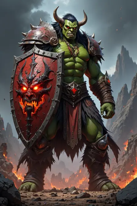 "영화 같은 전신 묘사: 고대의 나무 드루이드. 지혜와 자연의 힘을 지닌 존재가, 녹색 껍질로 만들어지고 살아있는 덩굴이 얽힌 거대한 방패를 휘두르고 있다. 이 방패는 유기적 걸작으로, 깊은 에메랄드와 이끼 같은 녹색의 껍질 층으로 표면이 질감 있게 구성되어 있으며, 나무에 새겨진 빛나는 룬문자가 교차한다. 화려한 덩굴들이 가장자리를 감싸며 작은 잎과 빛나는 꽃들을 피워내고, 마치 방패 자체가 살아있는 듯하다. 중심부에는 거대한 맥동하는 보석이 녹색 에너지를 뿜어내며, 자연의 마법의 심장처럼 보인다.나무 드루이드는 거대한 인체형 존재로, 거친 고대 껍질로 이루어진 몸체에 빛나는 이끼와 꽃이 팔에서 피어나 있다. 얼굴은 인간과 나무의 특징이 혼합되어 있으며, 깊숙이 자리한 빛나는 녹색 눈이 지혜로운 얼굴을 감싸고, 떨어지는 덩굴과 가지들이 자연스러운 왕관을 형성한다. 뿌리처럼 땅으로 뻗어 힘을 얻는 굽이진 손으로 방패를 편안히 잡고 있다. 잎과 덩굴로 된 흐르는 망토를 두르고 있으며, 드루이드는 생명과 영원한 지혜의 기운을 뿜어낸다.