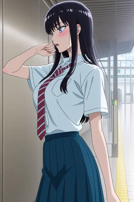 tachibana akira, 长发, 黑发, 紫色眼睛, 校服, 白色衬衫, 有领衬衫, 短袖, 红色领带, 条纹领带, 蓝色裙子, 百褶裙, 黑色过膝袜, 乐福鞋
